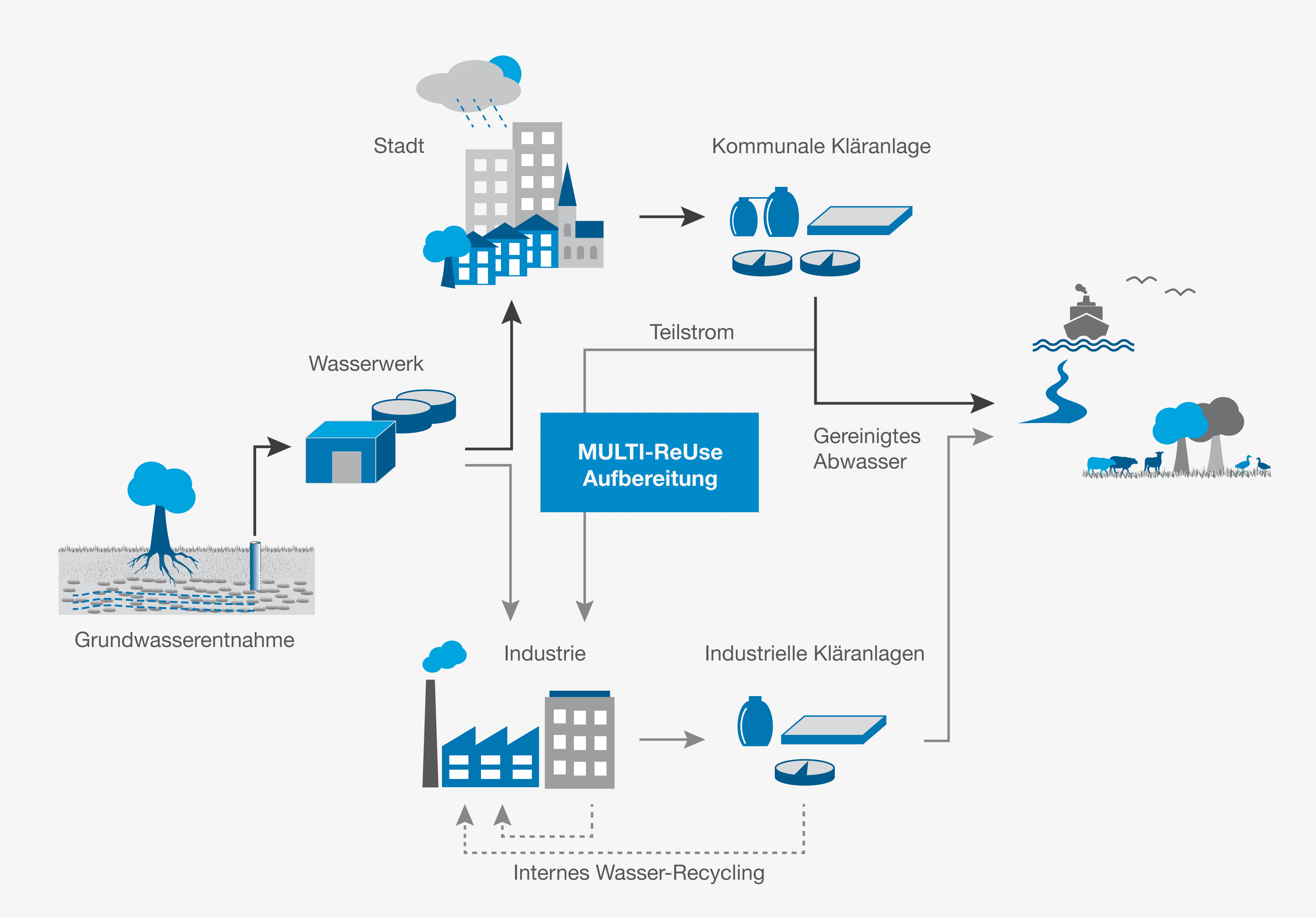 Infografik 2 MULTI-ReUseDie Grafik zeigt das Konzept für eine alternative Betriebswasserversorgung, wie es im Projekt MULTI-ReUse für die Stadt Nordenham betrachtet wird. Im Wasserwerk wird Grundwasser zu Trinkwasser aufbereitet und an die Haushalte und Gewerbe der Stadt sowie die Industrieunternehmen abgegeben. In den Industrieunternehmen wird durch internes Recycling und Mehrfachverwendung bereits Trinkwasser eingespart. Das häusliche Abwasser wird in der kommunalen Kläranlage gereinigt und danach in die Weser abgeleitet. Aus einem Teilstrom dieses Wassers wird mit Hilfe der MULTI ReUse Aufbereitung Betriebswasser für industrielle Verwendungszwecke hergestellt. Ziel ist es, einen Teil des in der Industrie für Herstellungs- und Reinigungsprozesse verwendeten Trinkwassers zu ersetzen und somit die Grundwasserressourcen zu schonen. Diese Grafik von MULTI-ReUse ist lizenziert unter einer Creative Commons Lizenz „Namensnennung - Weitergabe unter gleichen Bedingungen 4.0 International (CC BY-SA 4.0)“ – 1,26 MB [filesize]Download “Infografik 2 MULTI-ReUse” MULTI-ReUse_Infografik_2_de.jpg |